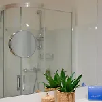 Τα μπάνια με μεσοτοιχία περιλαμβάνουν στεγνωτήρας μαλλιών και σκουφάκι μπάνιου.
